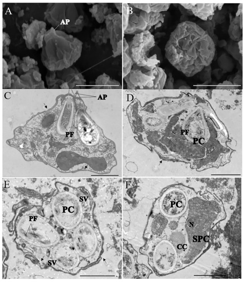 Electron microscopy of Kudoa. (A,B) SEM of K. iwatai spores. (A) Lateral view of K. iwatai by scanning electron microscopy. (B) Apical view of K. iwatai by scanning electron microscopy. Scale bar = 5 μm. (C–F) TEM of K. iwatai. (C) Ultrathin section of spore showing apical projection (AP), polar capsule (PC), and polar filament (PF). (D) Ultrathin section of spores showing details of desmosome-like valve junction at sutures. Note the extensive overlap of valves at sutures (black arrows). (E) Ultrathin section of spore showing four polar capsules (PCs), shell valves (SVs), and polar filament coils (PFs). (F) Ultrathin section of spore showing a capsulogenic cell (CC) with polar capsule and a sporoplasmic cell (SPC) with a nucleus (N). Scale bar = 2 μm.