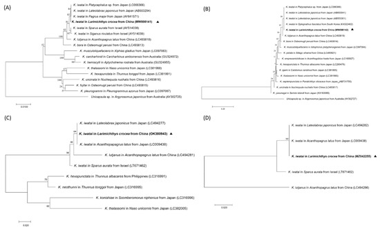 Phylogenetic trees of Kudoa. (A) Neighbor-joining (NJ) phylogenetic trees based on the SSU sequence dataset. (B) Neighbor-joining phylogenetic trees based on the LSU sequence dataset. (C) Neighbor-joining phylogenetic trees based on sequences of mitochondria of the cox-1 gene. (D) Neighbor-joining phylogenetic trees based on sequences of mitochondria of the rnl gene. The Kudoa species name is followed by the isolated host and isolated source and the GenBank accession number.