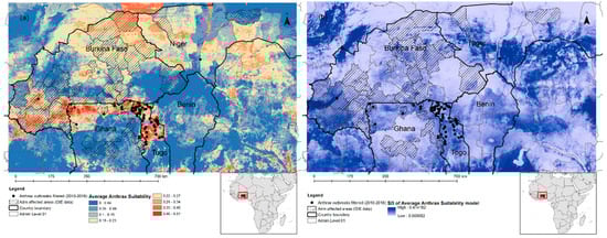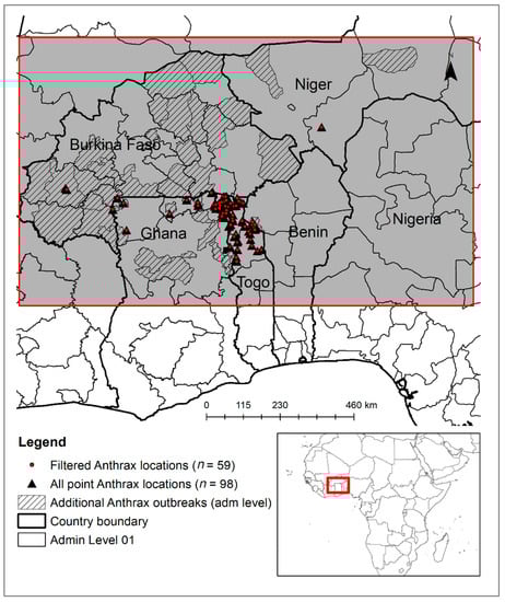 Anthrax is a significant problem in West Africa, where many countries in the region frequently experience outbreaks. At the end of the 20th century, the region was considered the largest hyper-endemic and epidemic anthrax area in the world due to widespread civil unrest and the resultant breakdown of veterinary health care systems, and the ecological and socio-economic factors present []. Anthrax remains a devastating disease in the region, especially in rural areas where livestock farming is a primary occupation and where capacities of veterinary services are weak. Lack of awareness, beliefs and behaviors, such as consumption of diseased animals, slaughtering of sick animals and eating or handling meat from infected animals, and dumping of dead carcasses in the open area, are some of the compounding factors of the persistence of anthrax in many countries of the sub-region []. As with many countries with poorly resourced public and animal health services, the disease is likely underreported: anthrax surveillance is often limited, and frequently animal outbreaks are detected only when human cases are identified [,]. There are few data or literature reports that accurately describe the occurrence of anthrax in either humans or in livestock and wildlife, areas of risk, and anthrax epidemiology in these countries [,]. However, this information is crucial to better prevent and control disease occurrence and inform surveillance. Ecological niche modeling [] is increasingly used for disease mapping in order to develop risk maps, and to identify temporal patterns and specific environmental factors that may be used to predict when outbreaks may occur []. The ecological suitability for anthrax occurrence has been predicted using a genetic algorithm for rule-set prediction (GARP) [], random forest [], boosted regression trees [] and the Maximum Entropy (MaxEnt) [,,,,] methods.