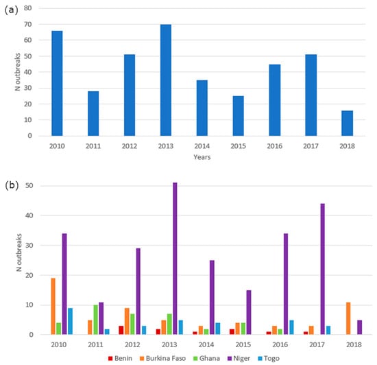 The number of reported outbreaks between 2010 and 2018 varied among the different data sources by month and year as well as in terms of different spatial units. Table S2 summarizes these data by country and data sources, while the spatial distribution is shown in Figure 1.