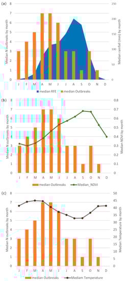 Median number of anthrax outbreaks (orange bar) against (a) median rainfall (blue area), (b) median NDVI (green line) and (c) median temperature (grey line) by month in the study area.