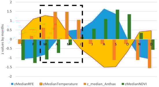 Periodicity of the standardized median number of anthrax outbreaks (z_median_Anthrax; orange bar), rainfall (zMedianRFE; blue area), NDVI (zMedianNDVI; green bars) and temperature (zMedianTemperature; yellow area) by month in the study area. The inset shows that the peak in anthrax outbreaks occurs between April and May, when the temperature decreases while rainfall and NDVI increase.