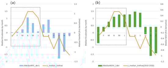 The standardized median number of outbreaks by month was significantly and positively related to the rate of change (first derivative) of standardized median precipitation by month during the period from January to June (linear regression, b = 1.8, t = 2.6, p = 0.05, adjusted R2 = 0.54). The peak of the standardized median number of outbreaks occurred in April–May, matching the period with the highest increment in precipitation (March–April), i.e., increased rate of change in standardized median precipitation by month (Figure 5a). During the same period (January–June), the standardized median number of outbreaks by month was positively related to the rate of change (first derivative) of standardized median NDVI by month (linear regression, b = 1.7, t = 5.5, p = 0.005, adjusted R2 = 0.85). The highest increase in vegetation growth occurred between April and May, fully matching the period with the highest number of anthrax occurrences (Figure 5b) and the maximum increase in precipitation rate. The relationship between the standardized median number of anthrax outbreaks and the second derivative of standardized median rainfall as well as the second derivative of standardized median NDVI by month was not significant (for both linear regressions, p > 0.05). There was also no significant relationship between the standardized median number of anthrax outbreaks and the standardized median temperature and its first and second derivatives by month (p > 0.05).