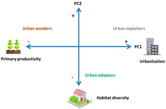The species use of urban habitats, or species urbanness, was calculated by ordering bird species according to environmental characteristics of the transects they occupied along the urban–rural gradients. Therefore, the median value of the eight environmental characteristics was calculated for each species (see [18]). A matrix of bird species as rows and environmental characteristics as columns was used to perform a principal components analysis (PCA) with the rda function of the vegan package in R version 3.6.1 [50,51]. PCA reduces a matrix of variables in a few axes through linear combinations [52]. Only those axes with eigenvalues greater than 1 were considered [53]. Axes were characterized according to their relation to environmental variables. The principal component score values for each bird species were used as the urbanness score.