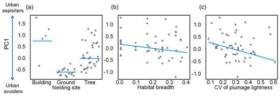 Relationship between the first principal component score values (PC1) of bird species and (a) nesting site, (b) habitat breadth, and (c) the intraspecific coefficient of variation (CV) of plumage lightness. Positive PC1 score values are related to urban exploiters, whereas negative values are related to urban avoiders. In (a) lines indicate mean values, whereas in (b,c) the lines indicate the fit of the phylogenetic generalized least square model.