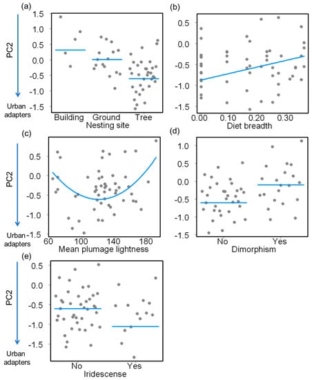 Relationship between the second principal component score values (PC2) of bird species and (a) nesting site, (b) diet breadth, (c) mean plumage lightness, (d) plumage dimorphism presence and (e) the presence of plumage iridescence. Negative PC2 score values are related to urban adapters. In (a,d,e) lines indicate mean values, whereas in (b,c) lines indicate the fit of the phylogenetic generalized least square model.