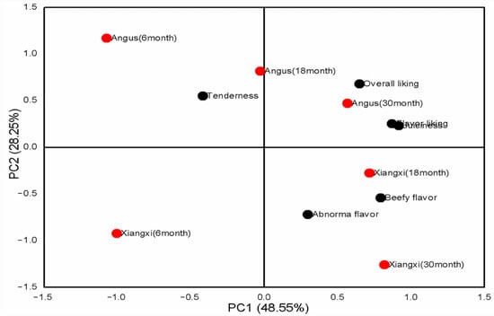 Principle component analysis (PCA) for sensory attributes of LT muscle from Angus and Xiangxi yellow cattle.