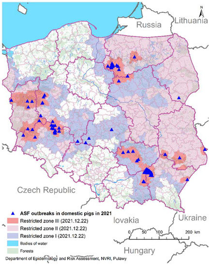 25]. Knowing that fact, the results shown in the maps were adapted to the current ASF zones, colors, and nomenclature.