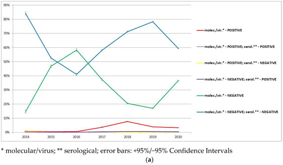 p = 0.40), all other years showed a significant difference compared to the reference year 2014. The chance of a positive molecular/virus result in 2015 was 1.7 times lower, in 2017 it was almost 2.5 times higher, in 2018 it was over 2.5 times higher, in 2019 it was 1.8 times higher, and in 2020 it was almost twice as high as in the reference 2014 (