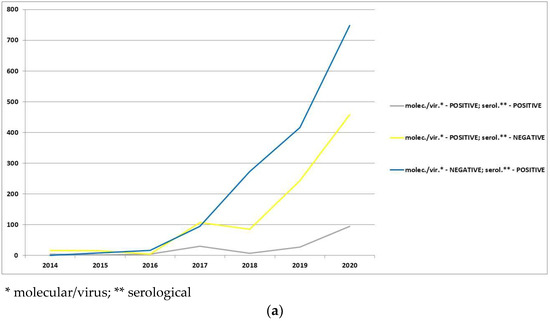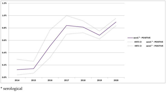 p = 0.93), all of the following analyzed years showed a significant difference compared to the reference year 2014. The chance of a positive serological result in 2016 was almost 4.5 times higher, in 2017 almost 5.5 times higher, in 2018 over 6.5 times higher, in 2019 5 times higher, and in 2020 it was over 5 times higher than in the reference 2014 (