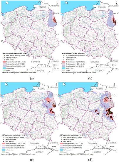 Figure 4d). The next year brought an increased number of new ASF outbreaks in wild boars. Moreover, an ASF outbreak in domestic pigs occurred in Podkarapckie province (previous ASF-free area;