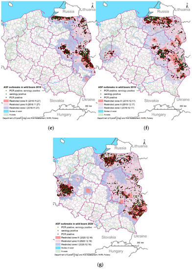 Figure 4f). In 2020, the first ASF-positive wild boars were detected in Pomorskie and Zachodniopomorskie provinces (