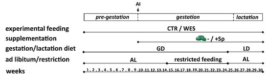 Schematic representation of the feeding experiment. AI: artificial insemination; AL: ad libitum; CTR: control diet; GD: gestation diet; LD: lactation diet; Sp: spirulina; WES: Western diet.