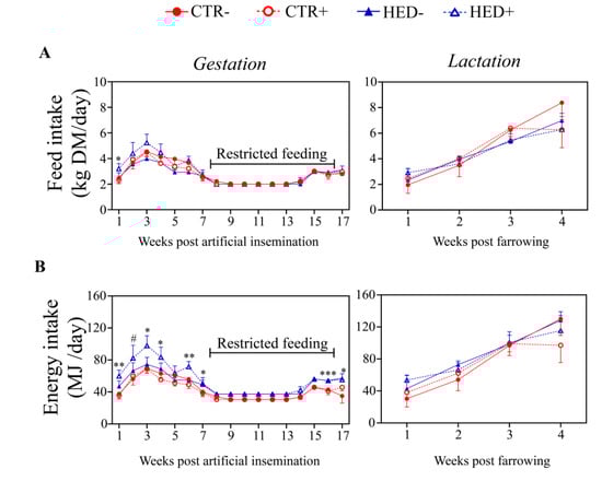 Effect of high-energy diet and spirulina supplementation on feed and energy intake of primiparous sows during gestation and lactation. (A) Feed intake during gestation and lactation (CTR- n = 5, CTR+ n = 6, HED- n = 5, and HED+ n = 4); (B) gross energy intake during gestation and lactation (CTR- n = 4, CTR+ n = 6, HED- n = 5, and HED+ n = 4). CTR: control diet; HED: high-energy diet. Data are presented in line graphs, where each point represents mean ± standard error of the mean (SEM). Significant differences were observed for dietary treatment (HED vs. CTR) and represented as * p < 0.05, ** p < 0.01, *** p < 0.001, and # p < 0.1 (trend). During the restricted feeding period, no statistical significance in energy intake was detected due to the absence of variance within groups.