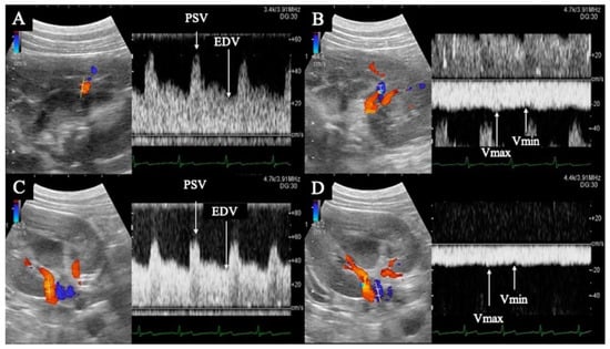 Flow waveform of the renal interlobar artery (A) and vein (B), and renal artery (C) and vein (D). (A,B) are horizontal sections of the kidney; (C,D) are transverse sections. The renal interlobar artery (A) and renal artery (C) show pulsatile waveforms with peak systolic velocity in systole (PSV) and end diastolic velocity (EDV) in diastole. The renal interlobar vein (B) and renal vein (D) show flat, continuous waveforms; the maximum velocity is Vmax and the minimum velocity is Vmin.