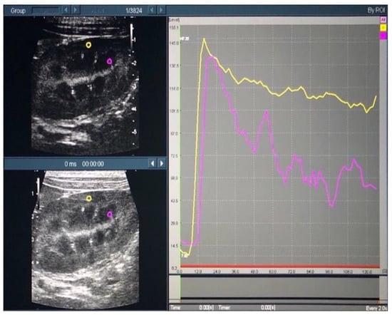 Time intensity curves (TICs) were plotted, based on the recorded contrast-enhanced ultrasound images, using the contrast harmonic imaging (CHI) analysis function of the ultrasound system. The region of interest (ROI) was set as a 2.0 × 2.0-mm circle in both the cortical and medullary regions of the left kidney (Figure 2).