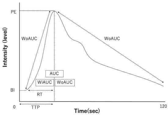 Schematic diagram of time intensity curves and each parameter. TTP—time-to-peak; RT—rising time; WiR—wash-in ratio; WoR—wash-out ratio; BI—base intensity; PE—peak effect (maximum intensity); AUC—area under the curve; WiAUC—wash-in AUC; WoAUC—wash-out AUC.