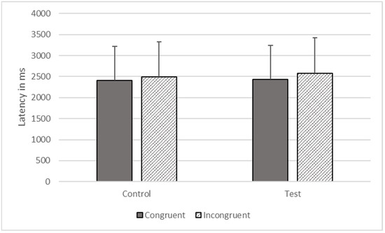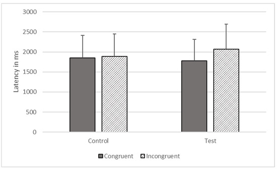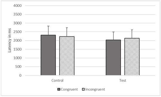 There were significant effects of type (F1, 1473 = 5991.633, p < 0.001) and congruence (F1, 1473 = 17.342, p < 0.001) on response time, but these effects were qualified by their interaction (F1, 1473 = 1491.423, p < 0.001). The gorillas responded more quickly on congruent (M = 2027.495, SEM = 464.530) compared to incongruent trials (M = 2126.589, SEM = 487.233), on test trials, but they responded more quickly to incongruent (M = 2220.597, SEM = 508.774) than congruent trials (M = 2307.586, SEM = 528.705) on control trials (see Figure 8).