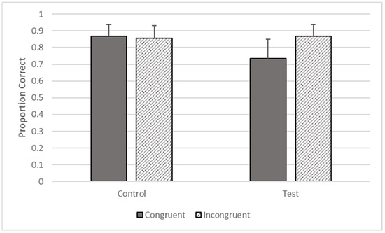 There were significant effects of type (F1, 3414 = 16.841, p < 0.001) and congruence (F1, 3414 = 15.312, p < 0.001) on accuracy, but these effects were qualified by their interaction (F1, 3414 = 25.797, p < 0.001). The gorillas responded more accurately on incongruent (M = 0.867, SEM = 0.069) compared to congruent trials on test trials (M = 0.735, SEM = 0.116), but there was no difference between incongruent (M = 0.856, SEM = 0.074) and congruent control trials (M = 0.869, SEM = 0.069, see Figure 6).