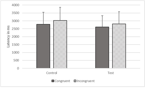 There was a significant effect of trial type (F1, 1473 = 19.684, p. < 0.001) on accuracy. The gorillas responded more accurately on control (M = 0.943, SEM = 0.049) compared to test trials (M = 0.883, SEM = 0.093), but there were no effects of congruence and no interaction.