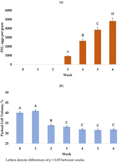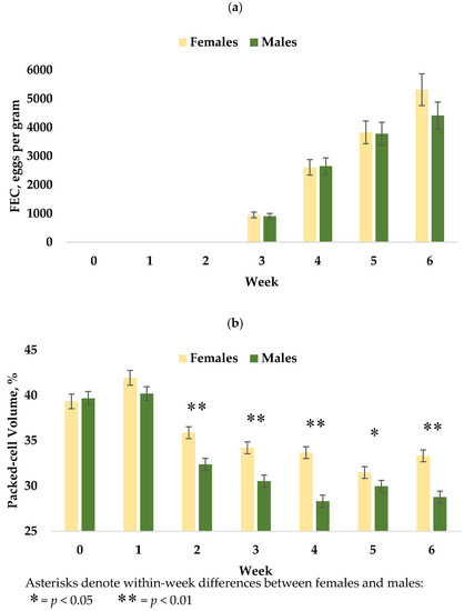 Packed-cell volume differed by week across the trial (p < 0.0001, Figure 1b). Ranges of PCV across trial from the start through week six were 28–56, 27–56, 22–44, 20–42, 20–43, 24–40, and 18–40%, respectively. By sex, PCV also differed (p < 0.0001) across the trial and female lambs were significantly higher at week two (36.0 ± 0.7 vs. 32.0 ± 0.7), week three (34.2 ± 0.7 vs. 30.1 ± 0.7), week four (33.7 ± 0.7 vs. 28.1 ± 0.7), week five (31.5 ± 0.7 vs. 29.6 ± 0.7), and week six (33.3 ± 0.7 vs. 28.4 ± 0.7), as displayed in Figure 3. No differences in PCV were observed by sire (Figure 2b) or with all two- and three-way interactions with week and sex.