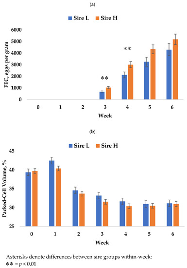 The greatest differences in FEC by sire were observed at week three (p = 0.009) and four (p = 0.0222). Although not significant at weeks five and six, it is worth noting that lambs from sire L recorded a lower FEC average at each of these weeks. A possible explanation is that Lambs from Sire L had a more rapid and/or favorable immune response. Escribano et al. [29] reported higher IgA titer levels in wool lambs selected for resistance versus more susceptible contemporaries, with the greatest differences being observed in the two weeks after the lambs were challenged with GIN. Similarly, higher levels of anti-H. contortus antibodies were reported by Toscano et al. [30] seven days post-inoculation in resistant versus susceptible Morada Nova lambs. Dargie and Allonby [31] showed that H. contortus metabolic activity (and egg output per female worm) were increased in hosts with fewer adult worms, potentially explaining why the FEC of the two sire groups slightly converged in later weeks of the trial. This suggests that lambs from sire L may have more effectively prevented larval establishment. To our knowledge, no other published reports have compared the effectiveness of within-breed FEC EBV as a predictor of offspring performance in a natural and artificial environment.