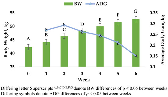 Differences (p < 0.0001) in mean weight at each weekly interval across the trial were observed (Figure 4), with an overall increase in mean weight (including both sexes) from 42.3 to 52.6 kg. Mean ADG did not differ by sire, however males (0.28 ± 0.01 kg/d) gained weight significantly faster than females (0.20 ± 0.01 kg/d; p < 0.0001).