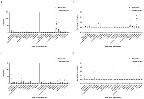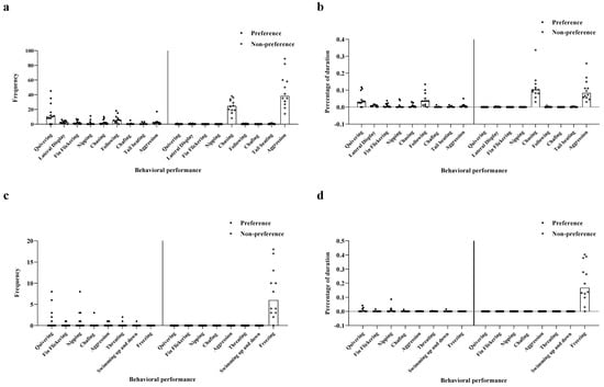 The behavioral intention of male and female fish in Experiment 2. (a) Frequency of female’s behavioral performance; (b) Proportion of the duration of behavioral performance in females; (c) Frequency of male’s behavior performance; (d) Proportion of the duration of behavior performance in males.
