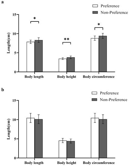 In experiment 1, the body length, height, and circumference of preferred females were significantly smaller than those of non-preferred females (body length: Z Test, W29.94 = 60.50, p < 0.05; height: Z Test, W29.40 = 47.50, p < 0.05; circumference: Student’s t test, t30.62 = −2.66, p < 0.05; Figure 2a).