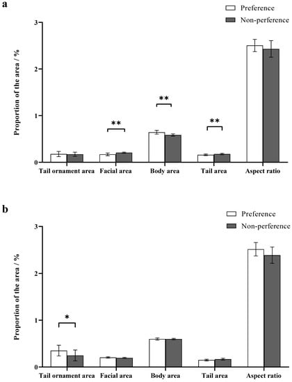 In experiment 1, no significant differences were found between preferred females and non-preferred females with regard to the proportion of yellow tail ornament area and aspect ratio (the proportion of yellow tail ornament area: Z Test, W30 = 127.00, p > 0.05; aspect ratio: Z Test, W30 = 151.00, p > 0.05, Figure 3a). The percentages of face and tail areas were significantly smaller in preferred females than in non-preferred females (facial area: Student’s t test, t14 = −4.56, p < 0.01; tail area: Student’s t test, t14 = −2.98, p < 0.01, Figure 3a). Moreover, preferred females exhibited significantly higher percentages of body areas than non-preferred females (body areas: Z Test, W30 = 228.00, p < 0.01, Figure 3a).