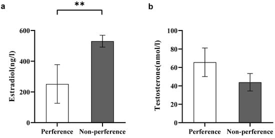 A previous study reported a close relationship between mate choice and mating behavior in sexual selection, indicating that sex steroid hormones are important []. Hormonal studies suggest that sex hormones influence courtship levels in different species [,]. Increased sex hormone levels cause higher courtship intensities. Steroid hormones in preference may primarily play a role in mate motivation, i.e., making males or females more likely to mate with certain partners of the opposite sex []. Estradiol levels in females are closely associated with reproductive status.