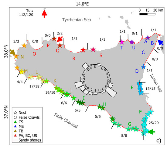 Sea turtle emergences reported in Sicily from 2017 to 2021 (a), 1944 to 2021 (b) and 1944 to 2016 (c), divided in Nests (stars) and False crawls (circles). Black lines perpendicular to the perimeter of the island indicate the 21 Physiographic Units (PU) identified by letters. The number of nests and the total number of emergences (nests + false crawls) are provided for each PU (in the form nests/emergences) and the totals are given in the top left of the figure. PUs letters are color coded with the Temperature Stations (arrows; Trapani Birgi: TB, Palermo: PA, Ustica Island: US, Boccadifalco: BC, Messina: ME, Capo Rizzuto: CR) that originated the data that were used to calculate IPMT. The circular plot in the middle provides mean annual nest density (nests km-1 year-1) for each PU.