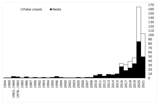 In the last decade, more efforts have been allocated on detecting sea turtle clutches laid along the coasts of Sicily. Beach surveys have been intensified and expanded to new areas, and local people have become more informed about sea turtle nesting and how to report a track. Such a positive trend was further boosted by a specific 5-years project (2017–2021; LIFE Euroturtles; www.euroturtles.eu (accessed on 1 March 2022) that increased technical capacity and monitoring efforts.