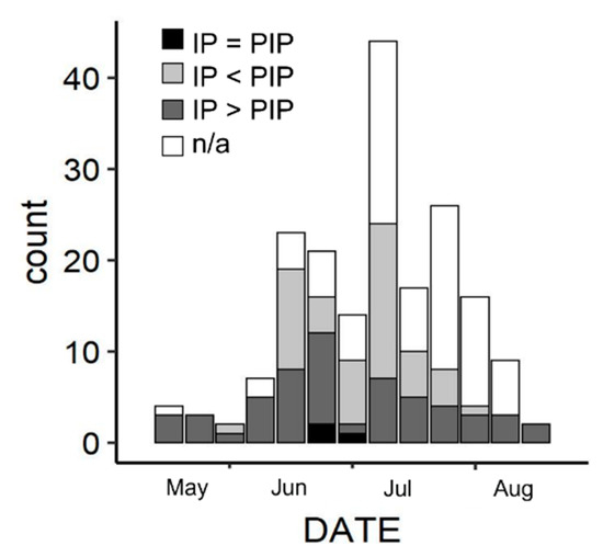 Fifty-five nests had IP > PIP (potentially producing more males), 50 nests had IP < PIP (potentially producing more females), and three nest had IP = PIP (potentially producing an equal number of males and females). Their seasonal and geographic distribution are shown in Figure 3 and Figure S1, respectively.