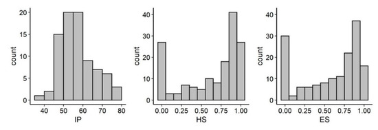 Frequency distribution of IP (n = 83), HS (n = 155), ES (n = 155) in loggerhead turtle natural nests in Sicily.