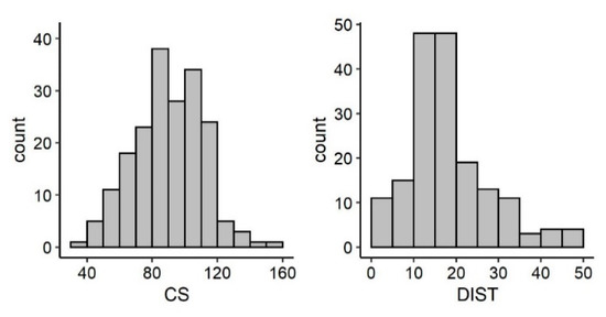 Frequency distribution of CS (n = 192) and DIST (n = 176) for all loggerhead turtle nests in Sicily.