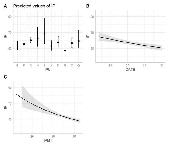 Predicted values of IP (estimated marginal means) of loggerhead turtle nests in Sicily plotted separately to show the effect of each IV, originated from the fittest GLM model. Dots in plot (A) show the predicted value for each PU, whiskers represent 95% CI. Plot (B,C) represent regression lines based on the GLM model with 95% CI in light gray. DATE: date of nesting (week of the year). IPMT: mean air temperature during the incubation period (°C).