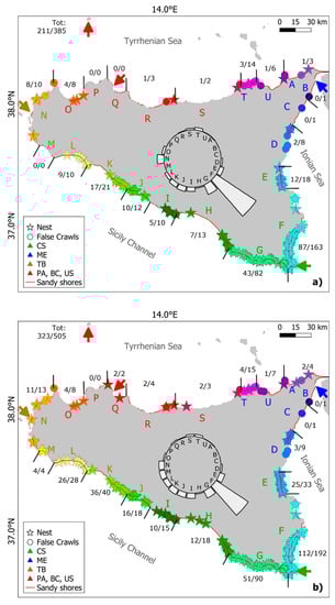 In the last decade, more efforts have been allocated on detecting sea turtle clutches laid along the coasts of Sicily. Beach surveys have been intensified and expanded to new areas, and local people have become more informed about sea turtle nesting and how to report a track. Such a positive trend was further boosted by a specific 5-years project (2017–2021; LIFE Euroturtles; www.euroturtles.eu (accessed on 1 March 2022) that increased technical capacity and monitoring efforts.