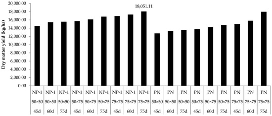 Variations in cultivars cause differences in the morphological characteristics. Grasses with higher growth rates usually have lower nutrient quality because the relatively high DM yield enhances the need to form more structural carbohydrates [4], while grasses with a greater growth performance actually have a higher nutrient quality [5]. The precise timing of defoliation to achieve an optimum yield and quality is generally related to the age of the plant, and the provided recommendations vary. A grass defoliation interval of 70 days or when the plant reaches 120–150 cm is recommended for optimal results and forage quality [6]. Moreover, Ferreira [7] suggests grass defoliation at 60–85 days of age, while Moran [8] noticed that the grass can be harvested after 25–30 days in the rainy season or 50–60 days in the dry season. These studies found that increasing the plant’s growing age increased the dry matter yield while decreasing the quality.