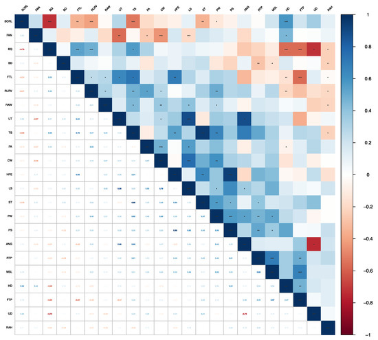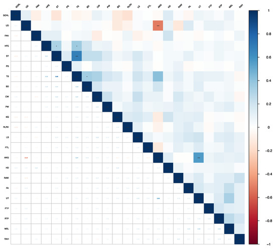 Phenotypic correlations between conformation traits in Chinese Holsteins. The upper triangle is the result of the significance test, and the lower triangle is the Pearson correlation coefficient. Blue represents a positive correlation and red represents a negative correlation. *: significant level less than 0.05, ***: significant level less than 0.001.