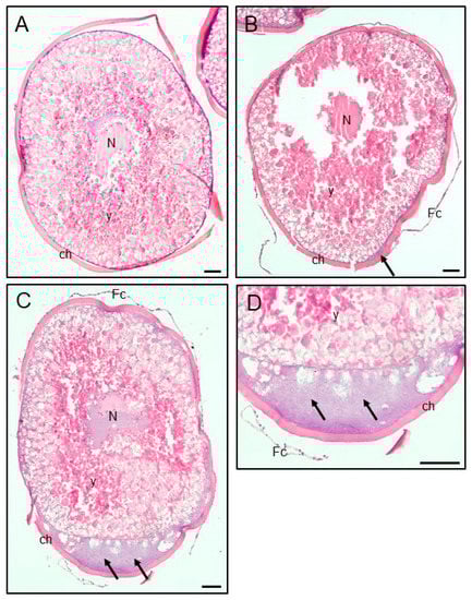 Morphological analysis of crucian carp (Carassius carassius) ovarian follicles from the control group (A) and those exposed to Roundup at a concentration of 1 (B) and 10 ng/mL (C,D). Arrows indicate the cytoplasm accumulated under the chorion that was more abundant following Roundup treatment (B–D) than in the control oocytes (A). Bar = 50 µm (A–D) ch, chorion; Fc, follicular cells; N, nucleus; y, yolk.