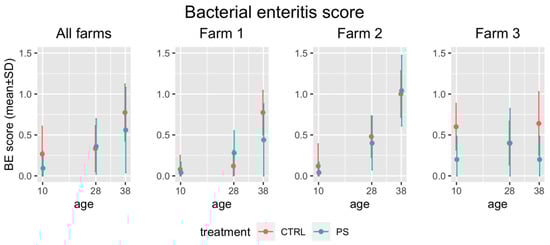 BE score measured in treatment (PS) and control (CTRL) groups at different time points by considering all farms together and then each one separately. BE scores are expressed on a scale from 0 (normal gastrointestinal tract) to 4 (severe dysbacteriosis).