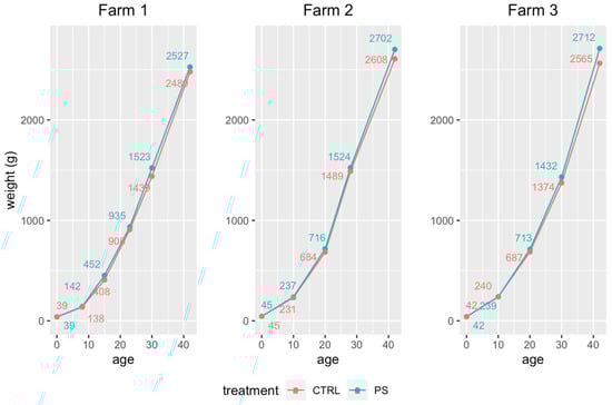 Live BW progression in synbiotic-treated (PS) and control chickens (CTRL).