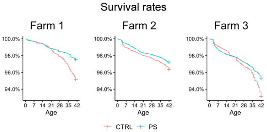 Kaplan–Meier survival estimates showing the mortality rates observed throughout the productive cycle in treated (PS) and control (CTRL) groups of each of the three farms.