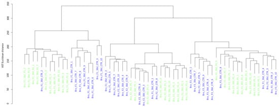 As shown in the dendrogram based on euclidean distances provided in Figure 4, samples clustered according to the farm in which they were collected. Samples from farm 2, which housed the progeny from eggs from 35-week-old layers, clustered more closely with farm 3 (progeny from 40-week-old layers) than with farm 1 (progeny from 30 weeks-old layers). Within farms, samples tended to cluster according to treatment, albeit with a few exceptions.