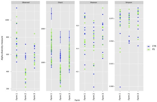 The differences between treatments within the same farm was also made visible by some of the alpha diversity measures, namely the Observed species and the Chao1 indexes, although were less evident according to the Shannon and Simpson indexes (Figure 5). The effect appeared particularly noticeable in samples from farm 2, with synbiotic-treated chickens showing a lower species richness than control birds.