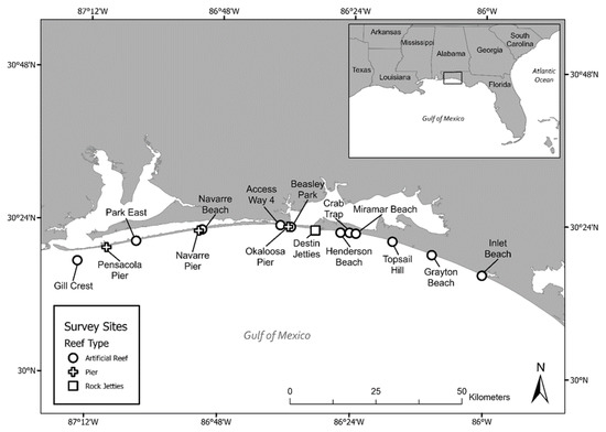 - Reimer, J.; Siegfried, T.R.; Roberto, E.; Piacenza, S.E. Environmental Context of Nearby Habitat, and Influence on Recreational Bycatch of Sea Turtles at Fishing Piers in the Eastern Gulf of Mexico. unpublished manuscript.