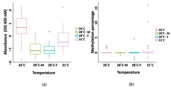 In order to investigate whether overall differential methylation in C. picta tails is present such that it would be a good indicator of the individual’s sex, we performed an ELISA assay to detect global methylation differences between temperature treatments (26 °C, 28 °C, and 31 °C). Standard curves were linear and displayed an R2 = 0.95 and R2 = 0.99 for the kit positive control (PC) and the turtle standard curve (TC), respectively. An ANCOVA revealed no significant difference between the slopes of the PC and TC standard curves (p = 0.6). Our ANOVA analysis between temperature and sex groups uncovered no significant difference in global methylation percentage or absorbance between males and females that could be used as a sexing marker (p > 0.05) (Figure 2, Table 1), although a permutation procedure [50] detected significantly higher within-group variance in percent methylation of 31 °C females than 26 °C males (but not among other groups).