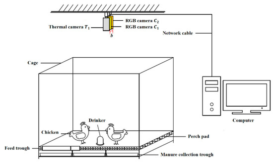 A binocular vision system was constructed in this experiment (Figure 1). Two dual-spectral thermography cameras (Hikvision, DS-2TD2636-10, 8~14 μm, uncooled core, China) were suspended 145 cm above the floor. The field of view was 87 cm × 47 cm on the ground. An RGB camera (6 mm, 1920 × 1080 pixels) and a thermal infrared camera (10 mm, 384 × 288 pixels) were included in a dual-spectral thermography camera. The baseline distance b between the binocular RGB cameras was 11.1 cm. The binocular RGB images and the left thermal infrared images were adopted for a 3D reconstruction of chicken images.
