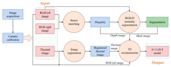 Generally, the 3D data can be obtained by binocular, time-of-flight (TOF), structured light cameras or light detection and ranging (LiDAR) [34]. The current techniques to reconstruct the 3D model with multi-source information rely on merging data from different sensors. These techniques can be divided into two categories: (i) The first method is to map the RGB and thermal information to a 3D point cloud. Susperregi et al. [35] presented a multi-sensor fusion approach that combined an RGB-D camera, a laser and a thermal sensor on a mobile platform for pedestrian detection and tracking. In addition to RGB-D cameras, LiDAR was also used for depth data acquisition [36]. Subsequently, some scholars also studied RGB-Depth-Thermal (RGB-D-T) reconstruction in human medicine. A multimodal sensor system including RGB, 3D depth, thermal, multispectral and chemical sensing was presented for wound assessment and pressure ulcer care [37]. An infrared thermal camera was combined with an RGB-D sensor to necrotize enterocolitis detection in preterm human infants [38]. Although depth cameras and range sensors could provide accurate point clouds, their precision and range were still affected during operation outdoors. (ii) The second method is an image-based point cloud reconstruction. Lagüela et al. [39] proposed a semi-automatic pipeline to generate an RGB-D-T model by image-stitching and surface reconstruction. An operator is still needed to verify the matches between RGB and thermal images. Ham and Golparvar-Fard [40] solved the image registration problem (the process of transforming different sets of data into one coordinate system to achieve image alignment) by simultaneously capturing RGB and thermal images. However, the multi-view stereo process [41] used for 3D reconstruction would take much more time. Several RGB-thermal point cloud registration approaches were assessed by Hoegner et al. [42]. The most accurate proposed method was based on the Iterative Closest Point (ICP) algorithm [43]. Generally, the key to the image-based point cloud reconstruction is to align the RGB and thermal images.